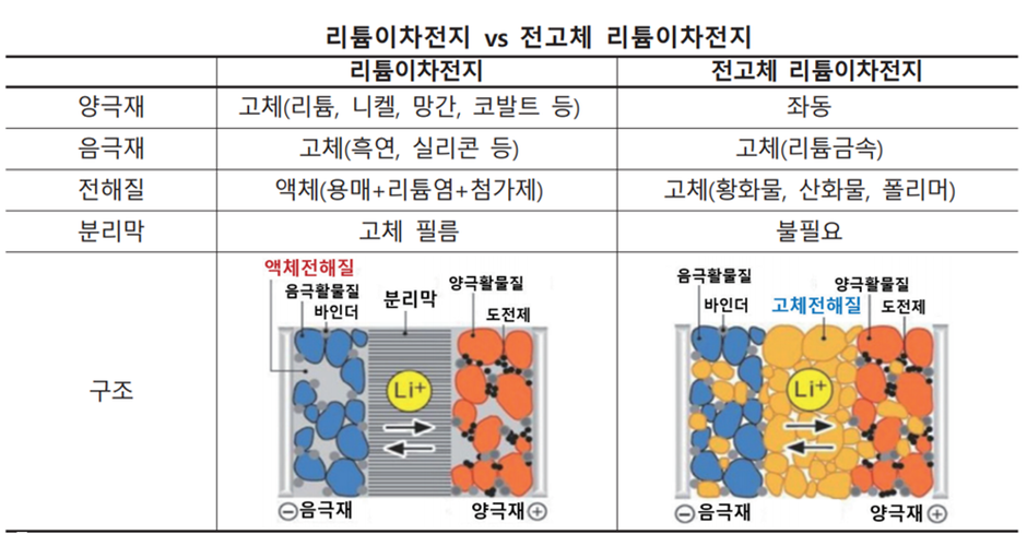 구조적으로 살펴보면 현재 사용하고 있는 대부분의 리튬이온 배터리는 양극과 음극 사이에 접촉을 방지하는 분리막이 위치하고 액체 전해질이 양극, 음극, 분리막과 함께 있지만, 전고체 배터리는 액체 전해질 대신 고체 전해질이 포함되면서 고체 전해질이 분리막의 역할까지 대신하고 있습니다.