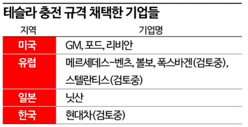 기존에 자기의 충전 방식만 고집하던 북미. 유럽. 일본. 한국 자동차 기업들이 하나둘씩 테슬라의 충전규격을 채용하고 발표하면서입니다.