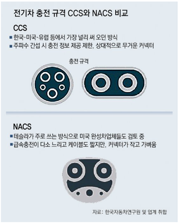 테슬라는 현재 산업표준 격인 ‘DC 콤보(CCS)’ 대신 고유의 방식인 ‘NACS’를 쓰고 있습니다.