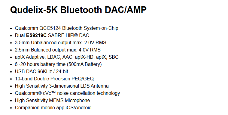 Qudelix 5K는 ESS Sabre ES9219C DAC 칩을 장착하여 높은 수준의 음질을 제공합니다. 이 칩은 뛰어난 신호 대 잡음비(SNR)와 왜곡율(THD+N)을 자랑하며, 풍부하고 정교한 사운드를 구현합니다. 특히, LDAC, aptX HD, aptX Adaptive 등 다양한 고해상도 코덱을 지원하여, 무손실에 가까운 오디오 전송이 가능합니다. 이러한 기술적 특징 덕분에 Qudelix 5K는 음악의 세부적인 음색을 고스란히 전달하며, 오디오 전문가들 사이에서 좋은 평가를 받고 있습니다.