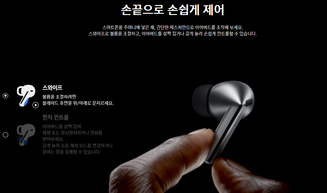 Buds 3 Pro는 오랜 시간 착용해도 귀에 무리가 가지 않도록 인체공학적으로 설계되었습니다. 이어팁은 소형, 중형, 대형으로 다양하게 제공되어 사용자 귀에 맞는 크기를 선택할 수 있으며, 가벼운 무게 덕분에 장시간 착용에도 피로감이 덜합니다. 또한, 이어버드의 터치 제어 기능을 통해 간편하게 음악 재생, 통화 수신, ANC 모드 전환 등을 조작할 수 있어 사용자 편의성을 극대화했습니다.