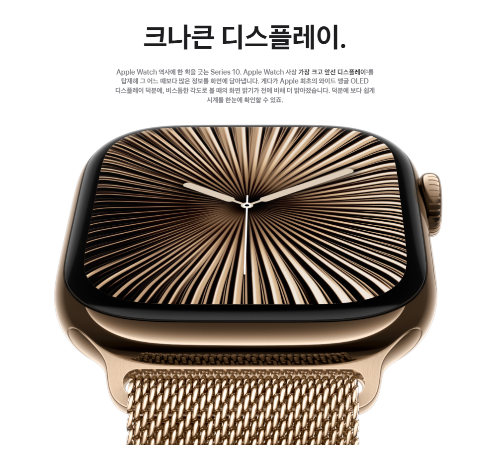 애플 워치 10은 45mm와 41mm의 두 가지 크기로 출시되며, 엣지-투-엣지(Edge-to-Edge) OLED 디스플레이를 적용하여 시각적 몰입감을 극대화했습니다. 20% 더 넓어진 화면과 2000니트의 최대 밝기로, 실외에서도 선명하게 사용할 수 있습니다. 특히 항상 켜져 있는 디스플레이(Always-On Display)기능이 더욱 발전되어 배터리 소모를 최소화하면서도 시계의 정보를 항상 확인할 수 있습니다.