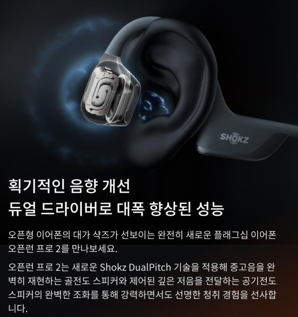 4. 고품질 음질: 이전 모델 대비 저음이 강화되어 보다 풍부한 사운드를 제공합니다. 이는 골전도 이어폰의 약점으로 지적되었던 음질 부분을 보완한 점입니다.
