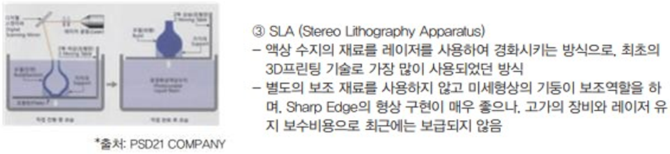 우리가 많이 사용 사는 방식은 FDM 방식과 SLA 방식이다. 현재는 SLA 방식에서 개선된 LFS 방식의 3D printer 도 많이 사용하고 있다. 고체 재료를 녹여 3D 형상을 만드는 용융 적층 모델링(FDM) 혹은 열가소성 수지 압출 적층(FFF) 방식 대신,액체 재료를 레이저로 실시간 경화시켜 형상을 만드는 광경화성 수지 조형(SLA) 방식의 3D 프린터를 만든다. SLA 방식 3D 프린터는 FDM 방식 3D 프린터보다 비싸지만 정밀도가 높다. LFS 방식은 빛을 형상 표면에 직각으로 쏘기 때문에 겉이 매끈한 3D 형상을 만들 수 있고 제작물의 일률성 및 일관성도 보장된다. 적은 힘으로 형상을 다듬는 플렉서블 탱크도 내장하고 있어 투명도가 높은 형상도 만들 수 있다.