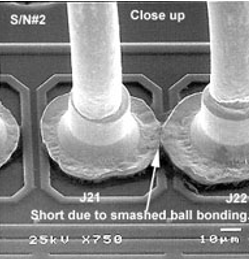 - Ball shorting : Ball bonding 부분이 서로 접촉하는 것으로 bond pad 사이의 거리가 불충분하거나 bonding 지점을 잘못 정하거나 wire parameter 가 잘못되었을 때 발생한다.
