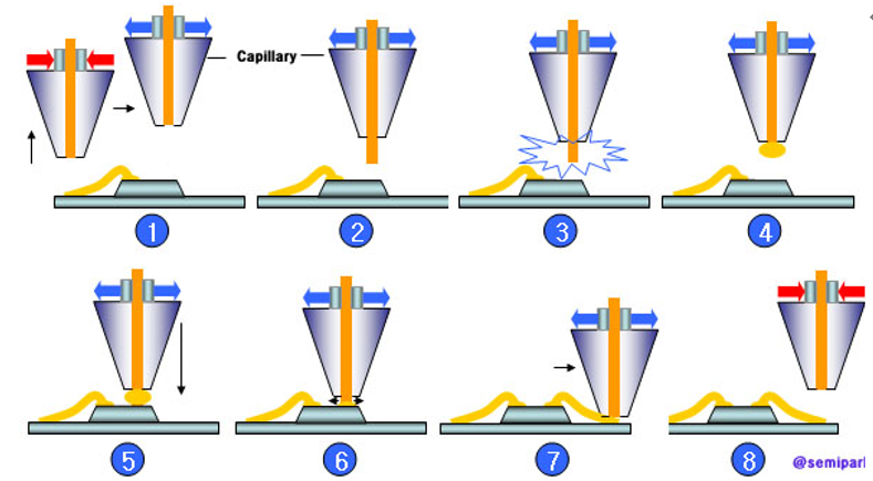 현재 모든 ball bonding 공정은 열, 압력, 초음파 에너지를 이용하여 wire 끝 부분에 용접점(weld)을 만든다. 사용되는 wire는 15μm 정도의 작은 직경에서부터 사람 머리카락 두께 정도의 용접 점도 이용된다. Wire 가 주입되는 가는 바늘 모양의 것을 'capillary'라 하며 주입된 wire에는 고 전압이 걸어 준다. 이로 인해 capillary(그림 2) 끝 부분에서 wire가 녹게 되고 용해된 금속의 표면 장력으로 인하여 wire 직경의 1.5~2.5배 정도의 ball(그림 1) 모양을 하게 된다. 이 ball 은 쉽게 경화되므로는 칩의 표면에 접착하기 위해 내려가고 칩은 사전에 125℃ 이상 가열되어 있어야 한다