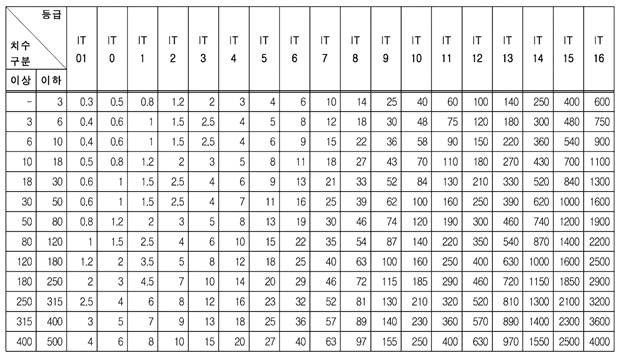 이것을 500mm까지의 치수를 표와 같이 구분하고 또, 공차를 01 급에서 18급 까지의 20단계로 구분해서 각 치수 구분마다에 치수 공차를 정한 것입니다.