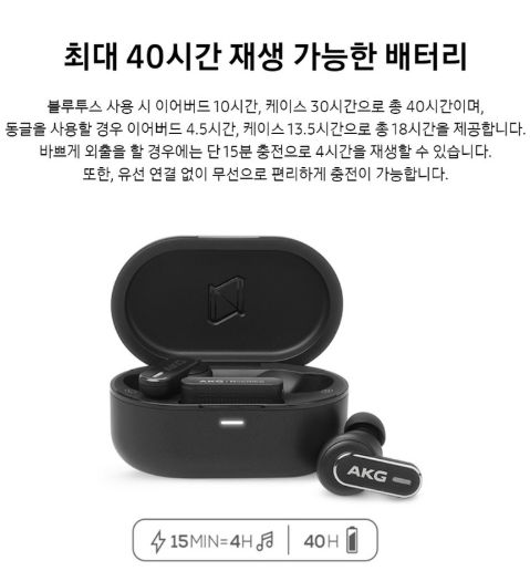 AKG N5 블루투스 이어폰의 배터리 성능은 상당히 우수합니다. 단 1회의 충전으로 최대 8시간 동안 사용할 수 있으며, 충전 케이스를 이용하면 총 24시간까지 배터리 사용 시간이 연장됩니다. 긴 사용 시간 덕분에 출퇴근길이나 장시간 운동 시에도 불편함 없이 사용할 수 있습니다. 급할 때에는 15분 충전으로 2시간 사용 가능한 빠른 충전 기능도 지원합니다.