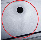 제품의 게이트 주위나 글자, 두께변화가 심한 부근에서 자주 발생합니다. 금형 충진 중 시간 내에 빠져나가지 못한 공기가 휘말려 소재에 갇힌 현상으로 성형품의 급격한 감압을 가하거나 날카로운 엣지부가 있을 경우 자주 발생합니다.해결법은 날카로운 엣지 부분이 없도록 설계하거나 감압 속도를 감소, 게이트를 이동시켜 해결해야 합니다.