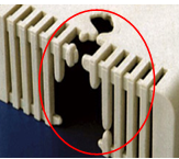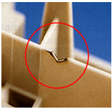 성형품의 표면에 타버린 흔적이 발생하는 현상으로 타버린 부위에 미 성형과 함께 자주 발생합니다. 캐비티의 마지막 부분에 빠져나가지 못한 공기가 순간적으로 단열 압축을 받아 높은 온도로 가열되면서 타버린 자국이 발생하므로 미 성형 원인도 같이 포함되어 보통 같이 발견할 수 있습니다. 이 경우 이젝터 핀 틈새나 금형의 형합면의 틈으로 가스와 공기를 빼주면 해결됩니다.