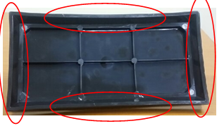보통 크기가 큰 Box 제품에서 발생합니다. 취약한 측면 벽의 중앙부가 내부로 휘는 현상이 발견되며 해결법은 성형 단계에서 코어부 냉각을 더 많이 시켜주거나 금형 설계 시 Warp를 고려하여 바깥쪽으로 볼록하게 설계, 또는 현상이 발생하는 부분에 보강대를 설계하는 방법이 있습니다.