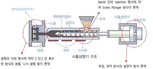 위 그림은 가장 기본적인 사출 성형기의 구조로 사출 기구와 형체 기구에 따라 수평식, 수직식이 존재하며, 그림은 수평식이고 금형은 이동식 형판과 고정식 형판 2단으로 이루어진 2단 금형, 내부 Barrel에 스크류를 사용하는 스크류 방식, 사출 실린더를 유압식으로 표현됐다.